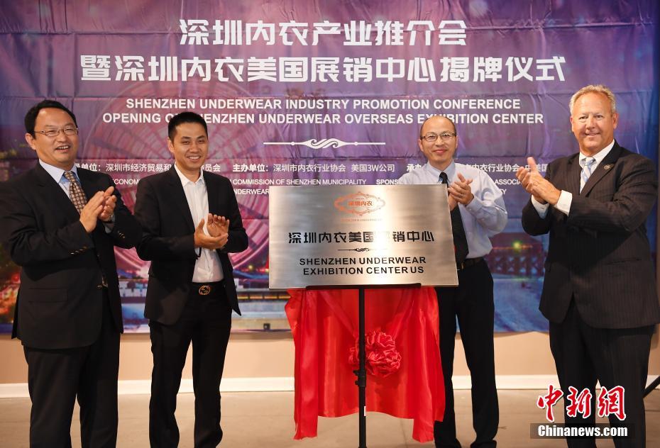 當?shù)貢r間7月17日,深圳市內(nèi)衣行業(yè)協(xié)會在中美國際(美東)創(chuàng)業(yè)港——默特爾比奇市Waccoma Center舉行深圳內(nèi)衣產(chǎn)業(yè)推介會暨深圳內(nèi)衣美國展銷中心揭牌儀式。中美國際(美東)創(chuàng)業(yè)港聯(lián)合深圳市內(nèi)衣行業(yè)協(xié)會為深圳內(nèi)衣品牌進駐美東市場搭建綠色通道和產(chǎn)業(yè)孵化平臺,采用“時尚秀+靜態(tài)展”的形式,促進中美內(nèi)衣文化和時尚的交流。圖為霍里郡議會主席馬克先生Mark Lazrus(右一)、深圳市經(jīng)濟貿(mào)易和信息化委員會副主任高林(左一)、美國3W公司董事長王為工(右二)、深圳市內(nèi)衣行業(yè)協(xié)會常務(wù)副會長兼秘書長張峰偉(左二)出席揭牌儀式。中新社記者 陳文 攝