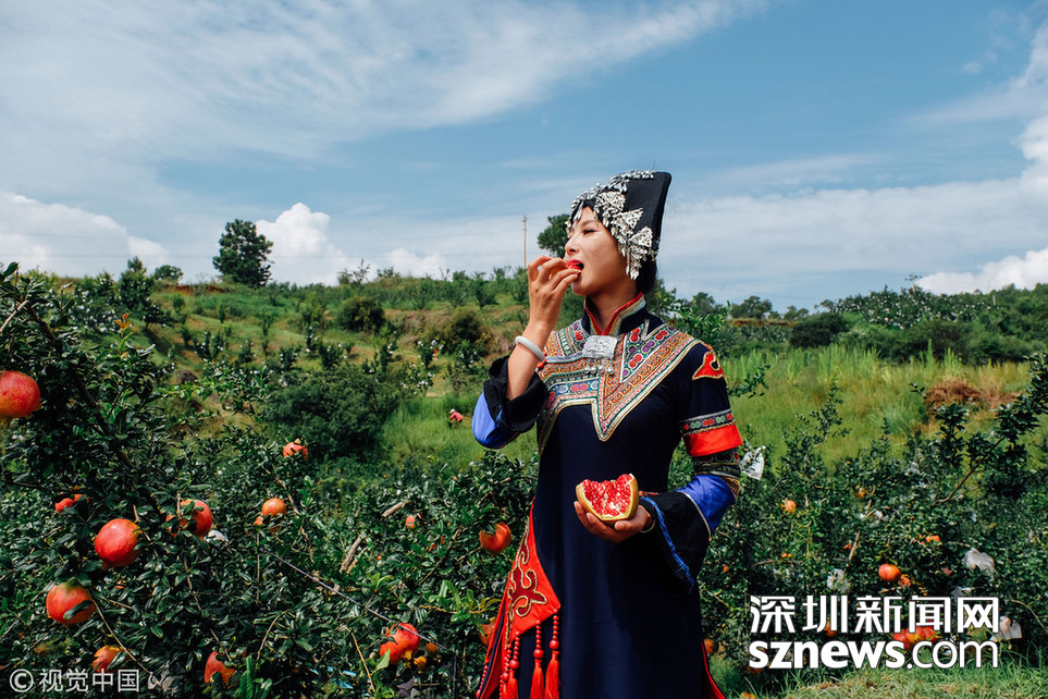 會(huì)理如今大面積種植來自北非突尼斯的軟籽石榴,籽粒柔軟,可以直接食用無需吐籽,果味兒濃甜似蜂蜜,可食部位達(dá)55.7%,自然儲(chǔ)藏可達(dá)3個(gè)月,冷庫(kù)儲(chǔ)藏可達(dá)5個(gè)月,是目前世界上籽粒最軟的石榴品種,也是中國(guó)石榴最優(yōu)秀的品種。拍攝當(dāng)天氣溫有些高,鄧通敏穿著比較厚的彝族服裝。完成拍攝后,她迫不及待想嘗嘗這剛從樹上摘下來的果子。“太巴適了!”鄧通敏說。
