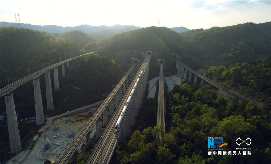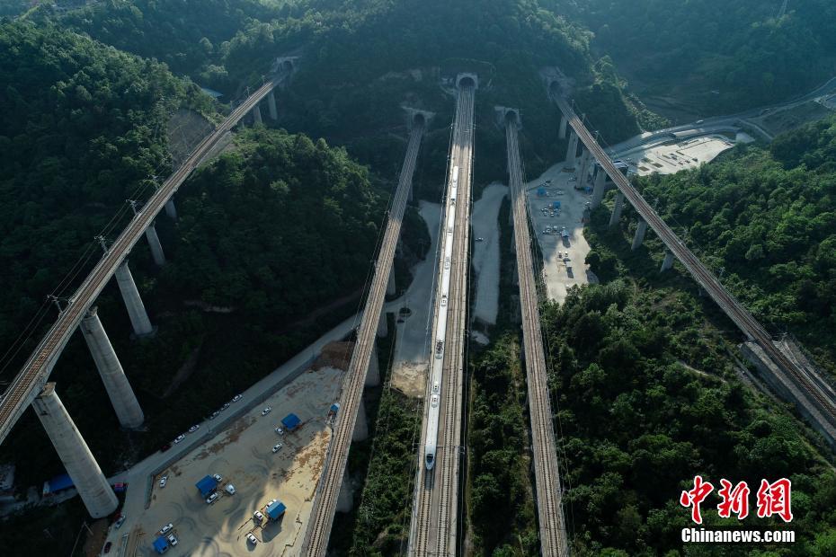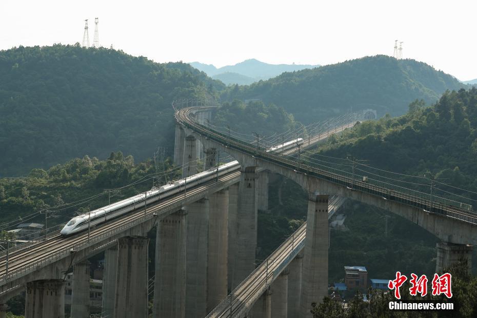 5月16日,航拍貴陽(yáng)市郊交織的五條高鐵線(xiàn)路,一列動(dòng)車(chē)駛出隧道。貴州省地處中國(guó)西南腹地,高原山地居多,因此高鐵建設(shè)的橋隧占比較高。在貴陽(yáng)市烏當(dāng)區(qū)新添寨,高鐵滬昆線(xiàn)、貴廣客運(yùn)專(zhuān)線(xiàn)、貴開(kāi)城際客運(yùn)專(zhuān)線(xiàn)的隧道和橋梁交織在一起,形成“五洞五橋”并行。中新社記者賀俊怡 攝 5月16日,一列動(dòng)車(chē)從貴陽(yáng)市郊交織的橋梁上駛過(guò)。貴州省地處中國(guó)西南腹地,高原山地居多,因此高鐵建設(shè)的橋隧占比較高。在貴陽(yáng)市烏當(dāng)區(qū)新添寨,高鐵滬昆線(xiàn)、貴廣客運(yùn)專(zhuān)線(xiàn)、貴開(kāi)城際客運(yùn)專(zhuān)線(xiàn)的隧道和橋梁交織在一起,形成“五洞五橋”并行。中新社記者賀俊怡 攝