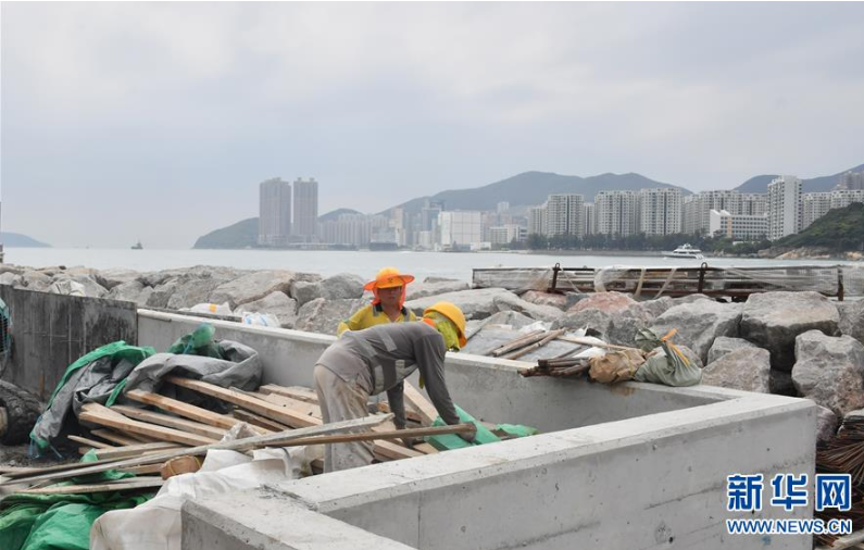 9月14日,工作人員在香港三家村放置沙包防止洪水。新華社記者呂小煒攝