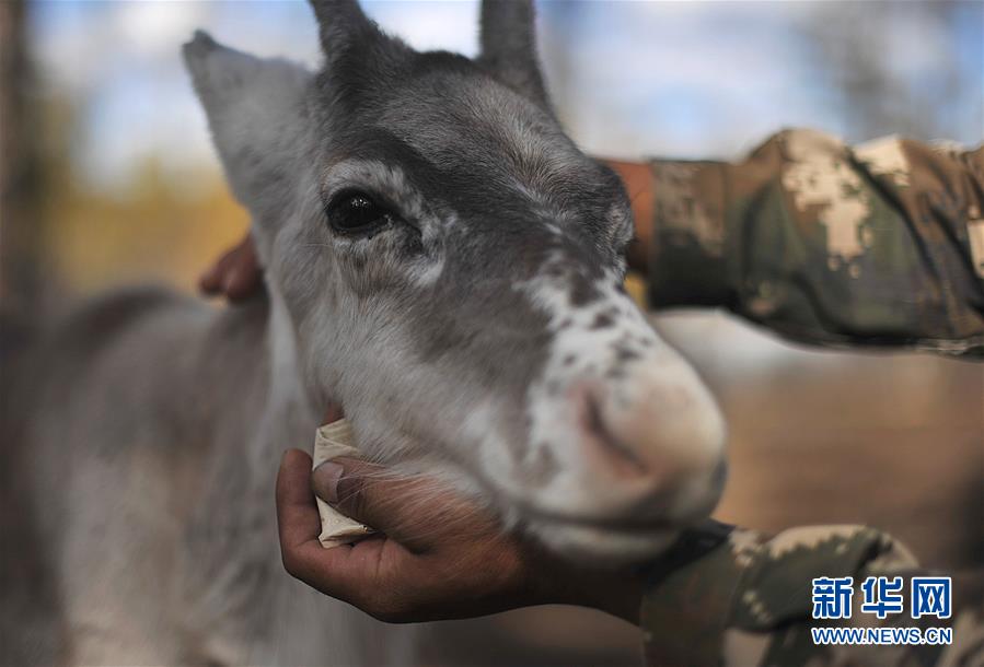 9月18日,在內(nèi)蒙古大興安嶺根河林業(yè)局約安里林場,林場職工張國華愛撫著馴鹿“混血寶寶”。新華社記者于洋攝