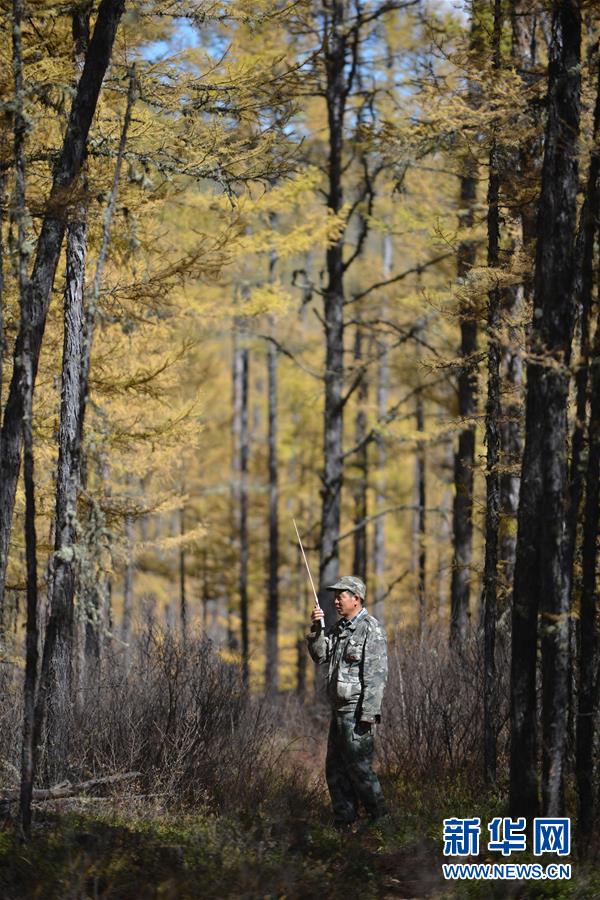 9月18日,在內(nèi)蒙古大興安嶺根河林業(yè)局約安里林場,林場職工廉立臣與其他林場職工通過對講機溝通尋找馴鹿的情況。新華社記者鄒予攝