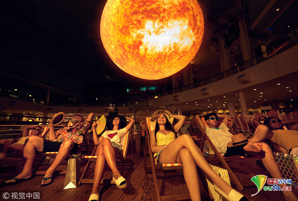 當(dāng)?shù)貢r(shí)間2018年9月18日,英國曼切斯特,顧客們在特拉福德購物中心的一個(gè)巨型的“太陽”下享受室內(nèi)日光浴,感受英國未完的史上最熱夏天。這個(gè)人造“太陽”的亮度相當(dāng)于1.2萬個(gè)燈泡。圖片來源:視覺中國