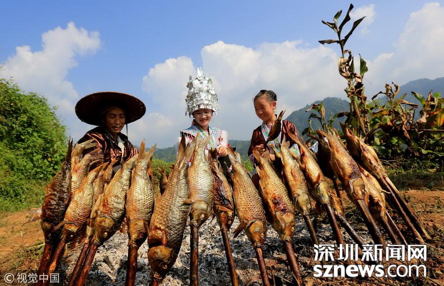 2016年9月17日,貴州省榕江縣平陽鄉(xiāng)硐里村七位侗家婦女們正燒魚。每年中秋時節(jié),當(dāng)?shù)囟弊逋_田放水,捉魚,全寨男女老少,野外生起篝火烤魚,用烤魚、米酒等,祭祀魚神,祈禱魚糧豐收的傳統(tǒng)民俗活動。