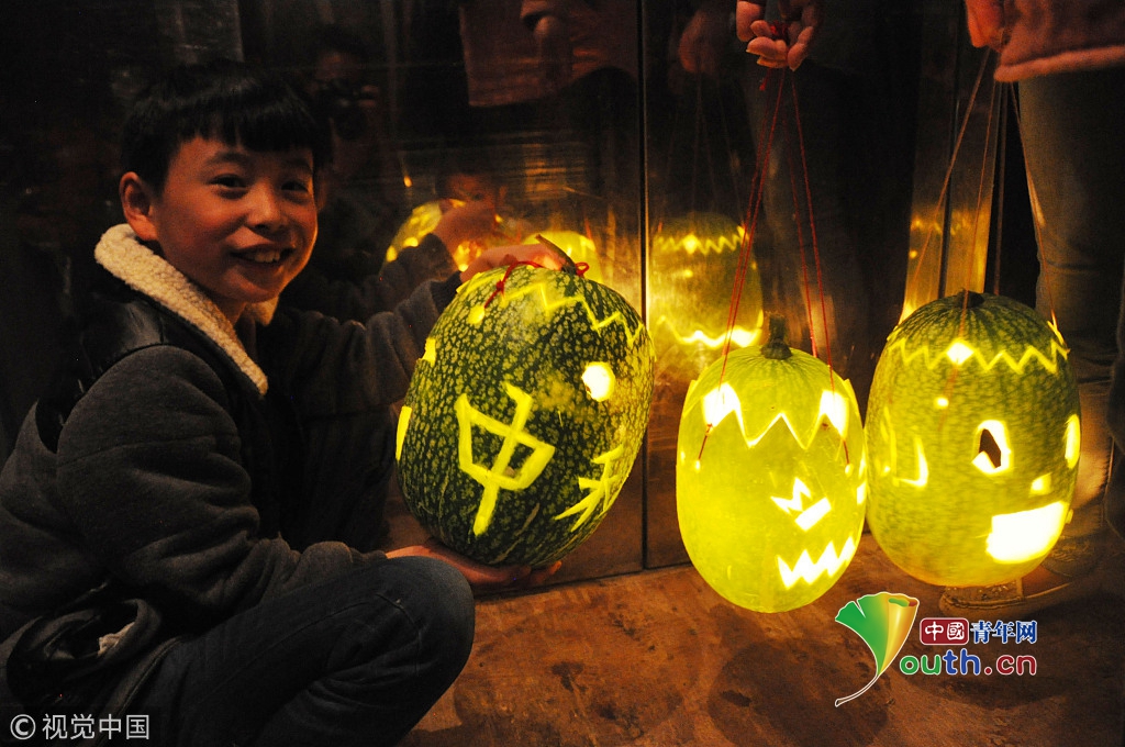 2015年9月27日,貴州省威寧縣海邊街道大洼塘社區(qū),一名孩子在展示手工制作的瓜燈。當(dāng)日,是中國傳統(tǒng)節(jié)日“中秋節(jié)”,群眾與孩子們一道制作手工瓜燈,歡度中秋佳節(jié)的到來,當(dāng)?shù)赜兄谱鞴蠠魬c中秋的習(xí)俗。