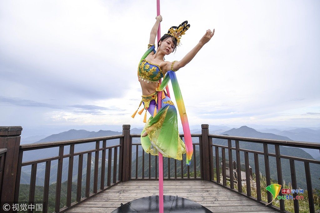 2018年9月20日,中秋節(jié)前夕,位于長三角第一高峰海拔1929米的浙江龍泉山頂,一場柔美的鋼管舞表演吸引了眾人圍觀。