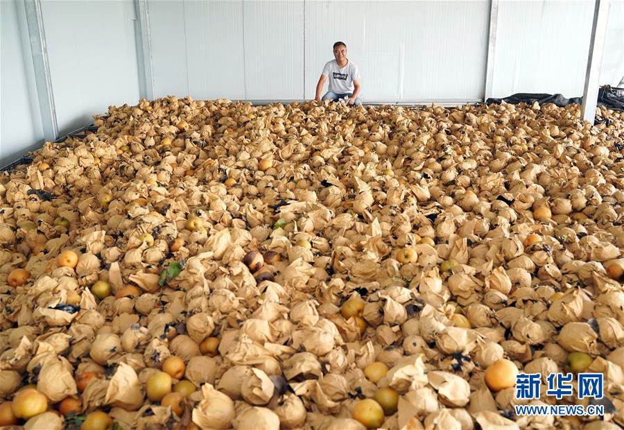 9月16日,在小崗村梨園公社種植基地,負責人黃慶昶與在網(wǎng)上電商平臺已售出即將裝箱的“大吉梨”合影。新華社記者才揚攝
