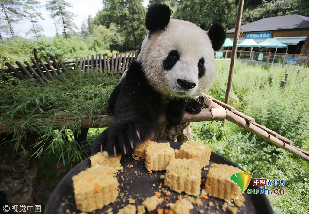 2014年9月4日,昆明,云南野生動(dòng)物園,大熊貓思嘉吃專屬胡蘿卜月餅。
