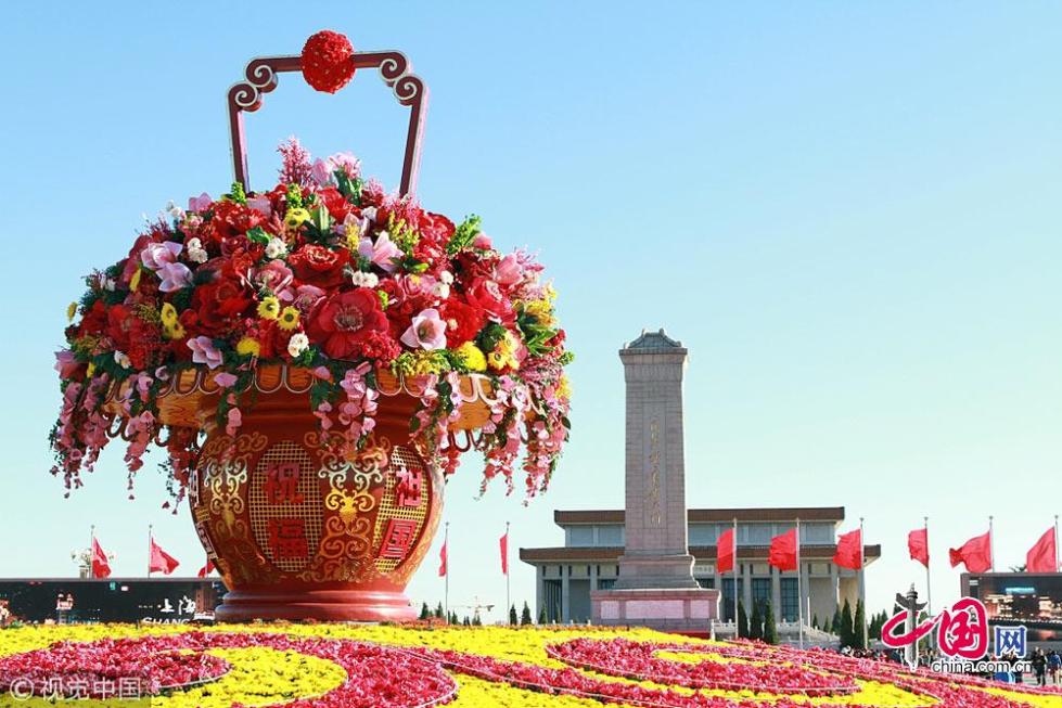2012年天安門廣場中心花壇以“祝福祖國”為主題,以喜慶的花籃為主景?;▔睆?0米、頂高15米,以紅黃兩色為主打,花籃外圍,環(huán)繞著花草組成的祥云圖案。同時,主花壇設(shè)有燈光效果,即便是夜間游賞,也能清晰地看到“花容”。祝福祖國“花籃”凈高13米,籃盤直徑11米,真假花結(jié)合,選取牡丹、桃花、紫藤、百合等18個品種的花卉,最大花卉直徑2米。“花籃”通體中國紅,體現(xiàn)喜慶、祝福之意,配有金色紋絡(luò),莊重、華貴?;@體鑲嵌三組“祝?!?、“祖國”字樣的燈箱?!盎ɑ@”底面是一品紅和小菊組成的如意圖案。