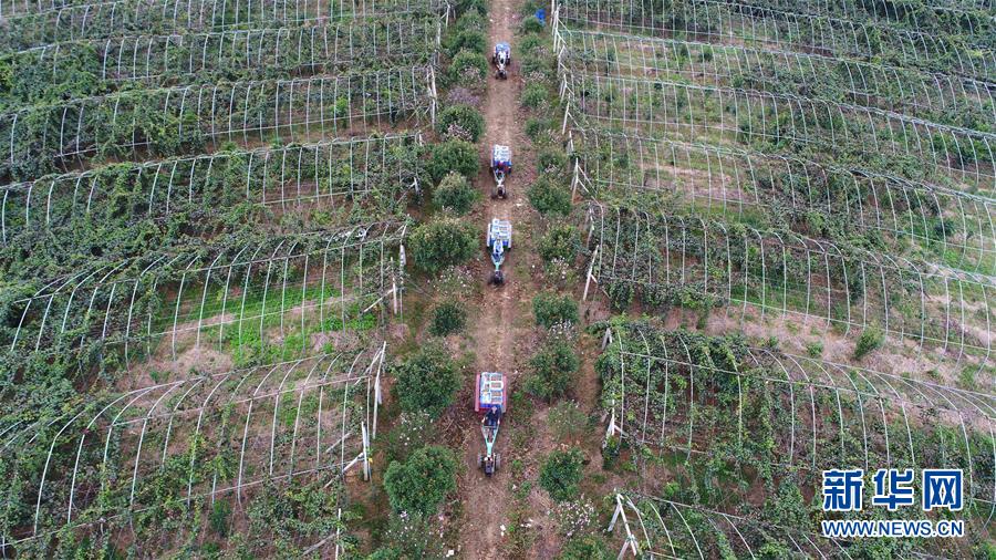 9月25日,在肥西縣銘傳鄉(xiāng)劉老圩獼猴桃種植基地,農(nóng)民運(yùn)送剛采摘的獼猴桃(無(wú)人機(jī)拍攝)。