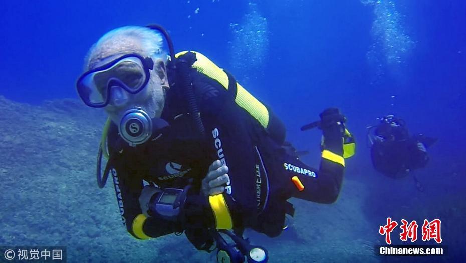 當(dāng)?shù)貢r(shí)間2018年9月1日,塞浦路斯,95歲的英國潛水員雷·伍利(Ray Woolley)以44分鐘下潛40.5米的成績打破了自己94歲達(dá)成的記錄(41分鐘下潛38.1米),二度刷新了世界上年齡最大的男性潛水員最好成績。在此次下潛中,這位二戰(zhàn)退伍老兵對(duì)距塞浦路斯南部城鎮(zhèn)拉納卡約2公里處的海域進(jìn)行了探索,1980年一艘名為“芝諾比亞號(hào)”(Zenobia)的貨船在這里進(jìn)行首次航行時(shí)沉沒。圖片來源:視覺中國