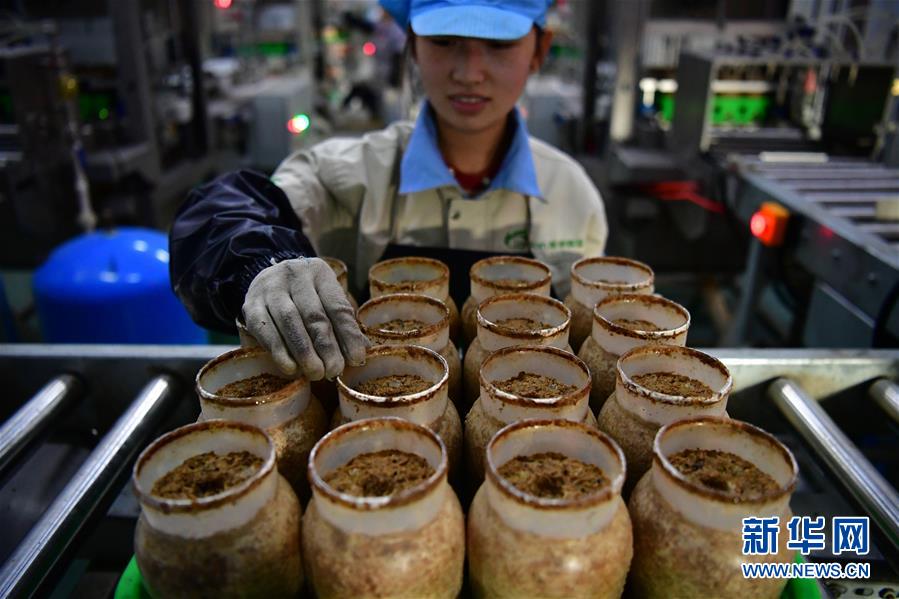 在位于清豐縣的河南龍豐實業(yè)股份有限公司,一名工人在車間查看補水過后的食用菌栽培瓶(9月28日攝)。新華社記者馮大鵬攝