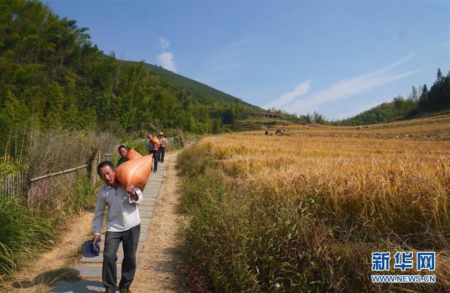 10月9日,村民在上堡鄉(xiāng)的高山梯田將收割完的稻谷運(yùn)送下山。 新華社記者 胡晨歡 攝