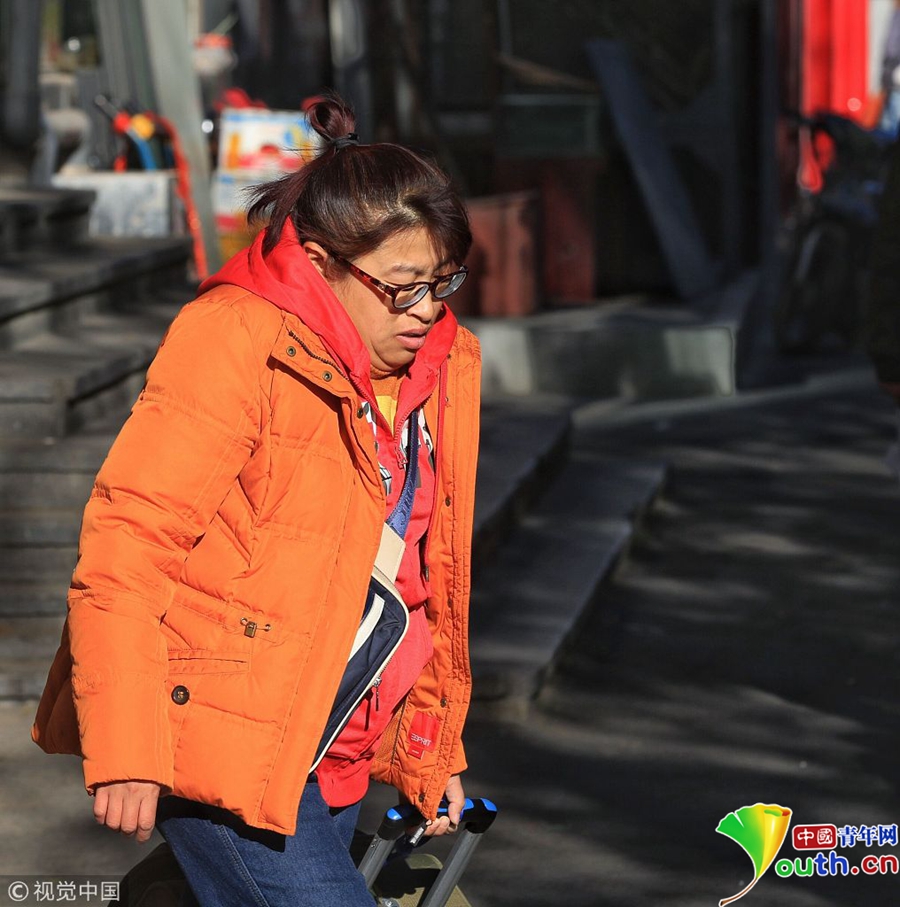 北京冷空氣來襲 游客紛紛著秋冬裝游覽天安門
