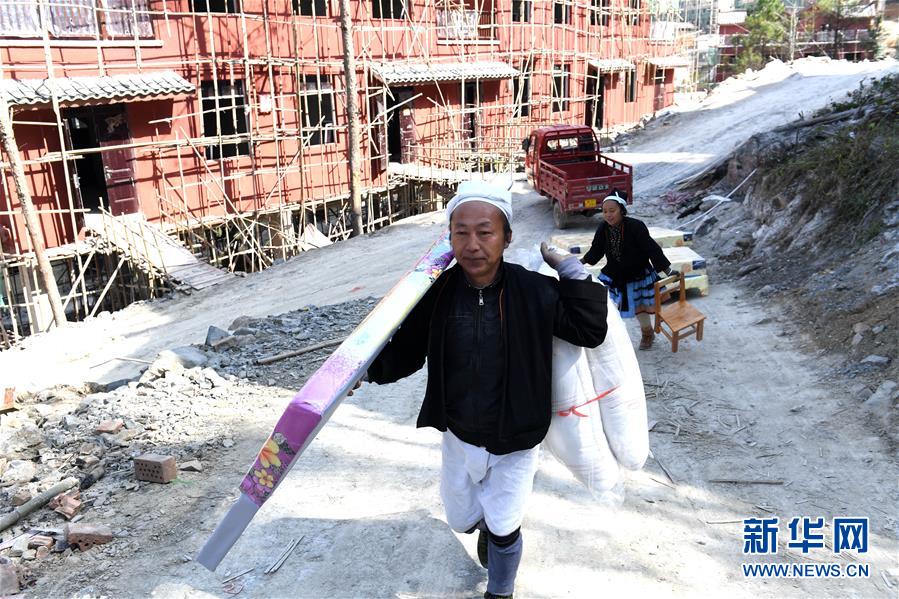 廣西南丹縣里湖瑤族鄉(xiāng)白褲瑤族同胞在將生活用品搬入新居(2月5日攝)。新華社記者 周華 攝