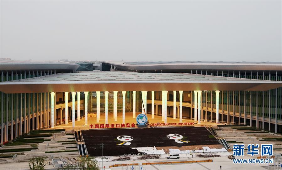 2018年9月30日,中國國際進口博覽會舉辦地國家會展中心(上海)南廣場燈光柱亮起,吉祥物“進寶”的圖案也裝飾到位。