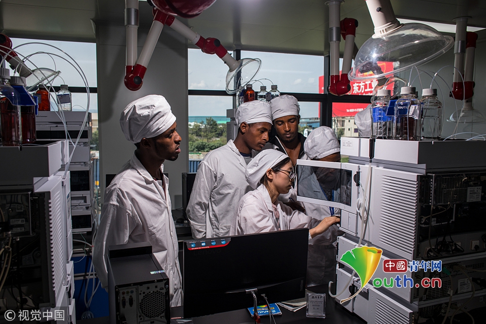 7月30日,埃塞俄比亞,首都亞的斯亞貝巴的東方工業(yè)園內一家中國制藥廠,27歲的中國員工汪紅梅為當地雇員講解液相色譜器械使用要領。整個實驗室共有4名中方員工和18名當地雇員。