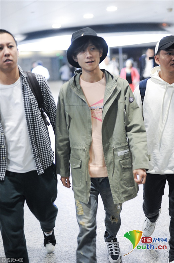 2018年10月14日,上海,張一山抵達上海機場。張一山戴漁夫帽眼袋嚴(yán)重瞬間老十歲, 用手擋臉?biāo)撇辉干乡R。