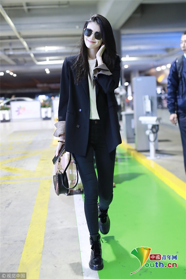 2018年10月15日,上海,何穗亮相機(jī)場。她身穿深色西裝搭配黑色緊身褲大秀超模身材,簡約造型依舊高級感十足,輕撩秀發(fā)散發(fā)女人味。