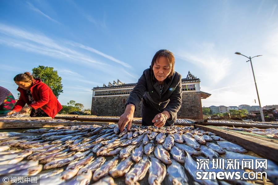 江西都昌縣薌溪鄉(xiāng)的漁民趁著晴好天氣翻曬捕撈上岸的魚(yú)蝦。