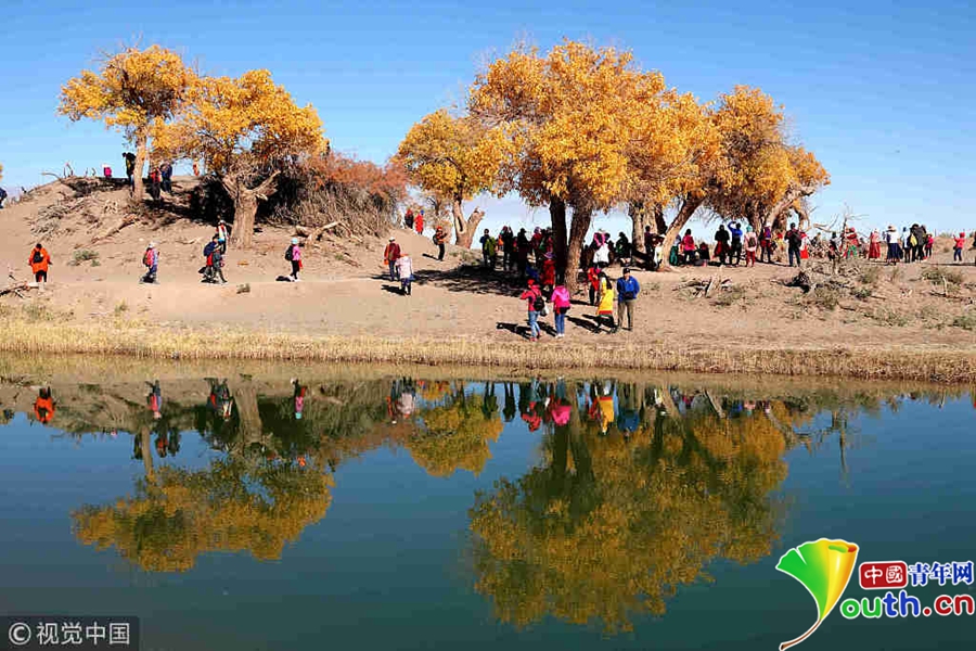 游客在胡楊樹(shù)下拍照。