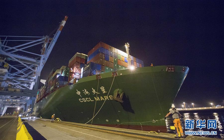 10月15日晚,中遠(yuǎn)海運旗下的“中?;鹦恰碧柤b箱輪??吭诒壤麜r澤布呂赫港集裝箱碼頭。 新華社記者 葉平凡 攝