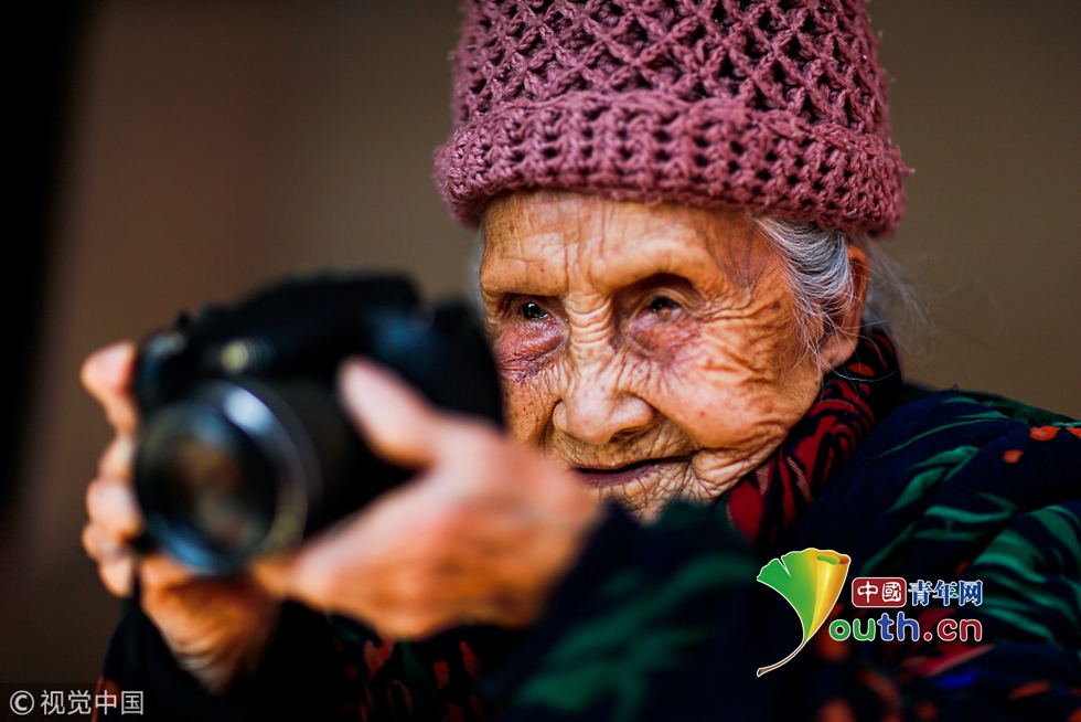 2017年03月02日,廣西壯族自治區(qū)桂林市恭城瑤族自治縣蓮花鎮(zhèn)蓮花街上,有一個(gè)慈眉善目的老人李玉珍,大家都親切地叫她“容伯娘”。她不僅是鎮(zhèn)上碩果僅存的兩位百歲老人之一,還是鎮(zhèn)上那個(gè)最老照相館的攝影師。老人拿起數(shù)碼相機(jī)拍攝照片的眼神依舊犀利。圖片作者:游擁軍/視覺(jué)中國(guó)