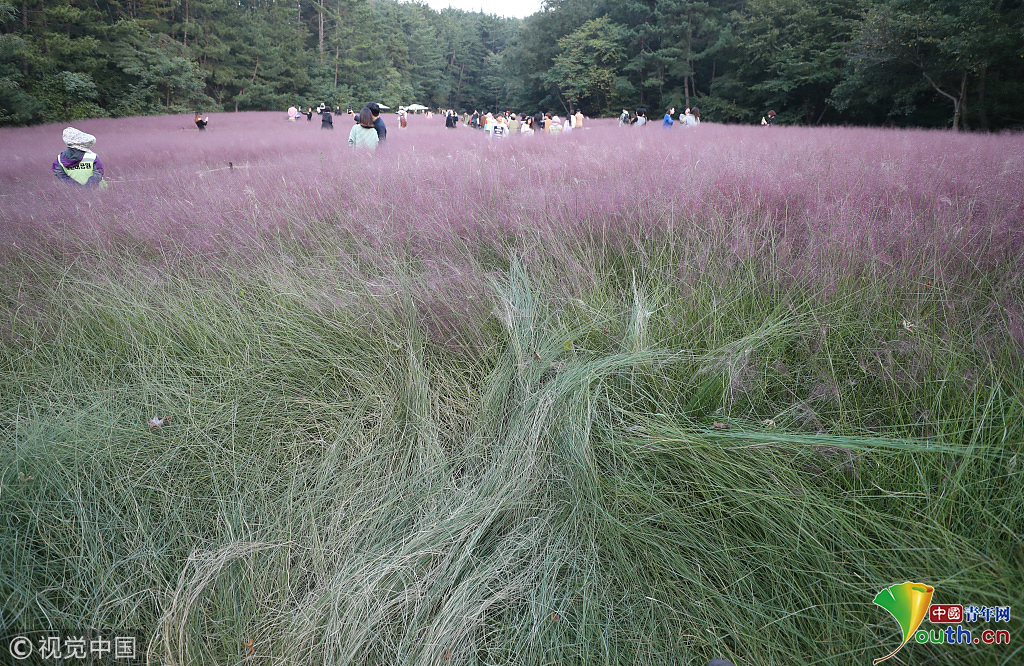 當(dāng)?shù)貢r間2018年10月16日,韓國蔚山,近日,蔚山公園大片粉黛亂子草盛開,粉紅花海浪漫十足,但部分花海遭游客隨意踩踏。圖片作者:Yonhap News Agency
