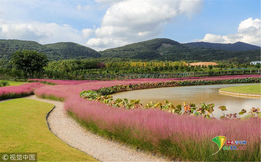 由于這些粉色亂子草圍繞一個圓形的池塘種植,從空中俯瞰則是另外一番景象,湖心島、池塘,粉黛、草坪與周邊的綠色植物形成了一個特別的唯美圖案。
