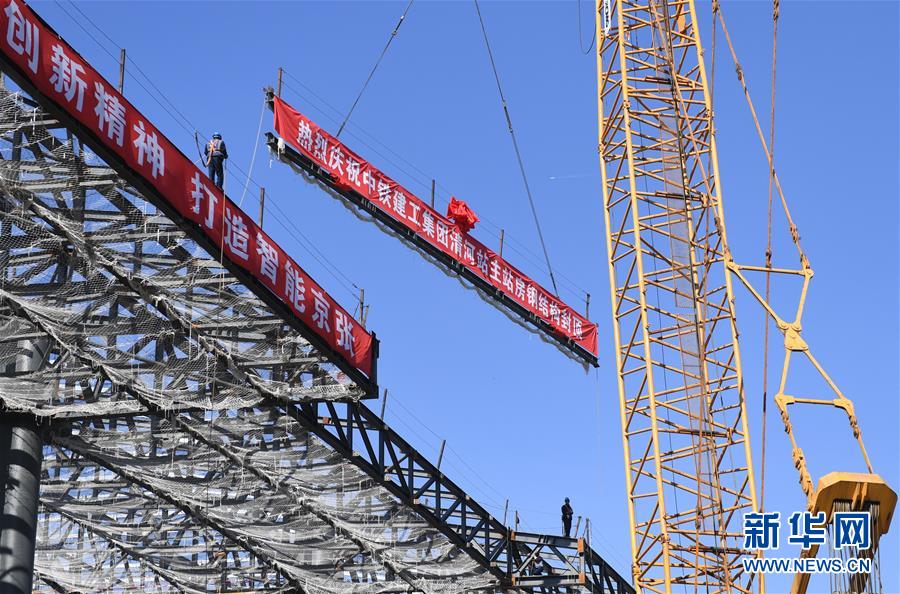 最后一組鋼梁吊裝到位(10月17日攝)。當(dāng)日,京張高鐵新建車(chē)站——清河站主體結(jié)構(gòu)正式封頂。清河站是京張高鐵建筑面積最大的車(chē)站,同時(shí)也是京張高鐵在北京地區(qū)的始發(fā)站之一。 新華社記者 張晨霖 攝