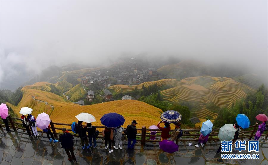 10月16日,游客在秋雨中欣賞龍脊梯田秋色。金秋時(shí)節(jié),廣西龍勝各族自治縣龍脊梯田美如畫卷。 新華社記者 黃孝邦 攝