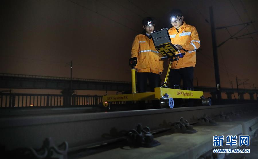 10月18日,劉訓飛(右)和郎海鵬在滬寧城際上海安亭北線路所42#道岔上使用軌檢小車檢測線路。 新華社記者 方喆 攝
