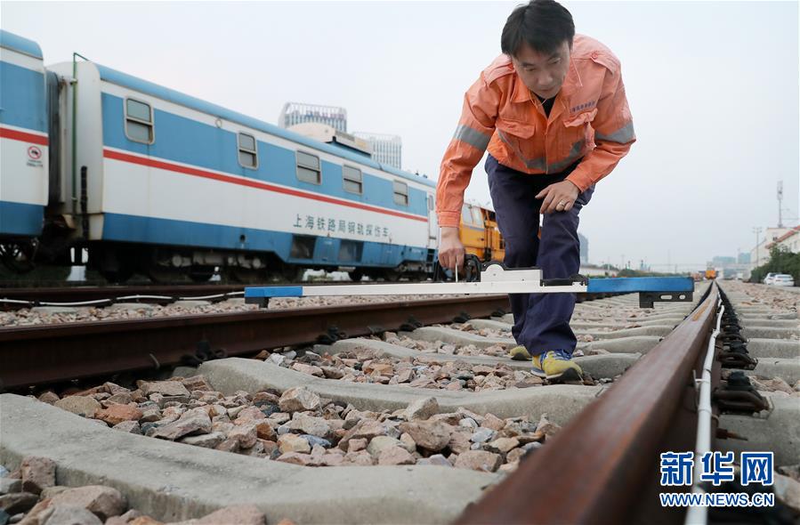 10月18日,劉訓飛在滬寧城際上海安亭北線路所42#道岔上使用軌檢小車檢測線路。 新華社記者 方喆 攝
