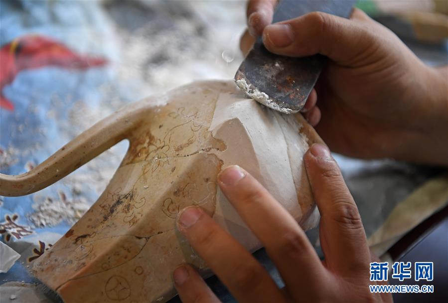 10月18日,在江西景德鎮(zhèn),工作人員修復(fù)一件瓷器。 新華社記者 萬(wàn)象 攝