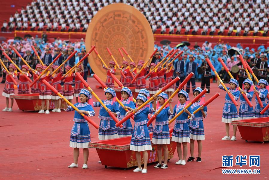 10月20日,各族同胞在廣西大化瑤族自治縣江濱文化廣場(chǎng)表演節(jié)目,慶??h慶。