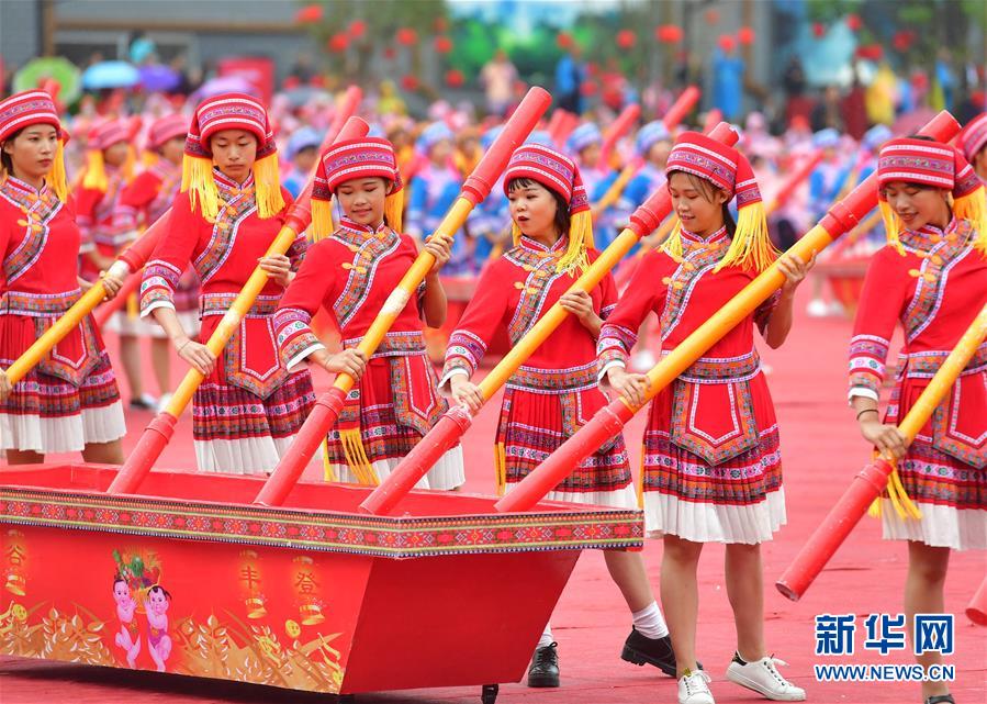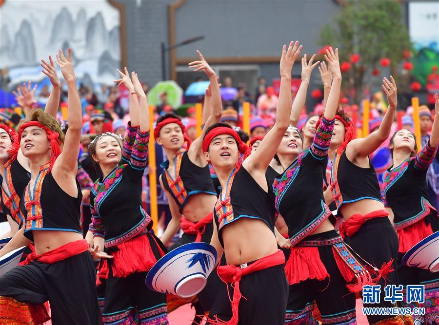 10月20日,各族同胞在廣西大化瑤族自治縣江濱文化廣場(chǎng)表演節(jié)目,慶??h慶。