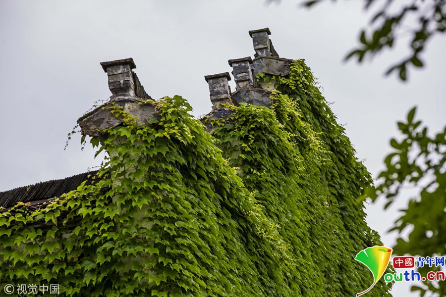 2018年5月6日,安徽省黃山市黟縣秀里村郁郁蔥蔥、枝葉茂盛的爬山虎爬滿了村里一幢幢徽派古民居,儼然一座座“綠色城堡”,綠意盎然爬山虎與粉墻黛瓦相映成趣,仿佛“綠野仙蹤”。
