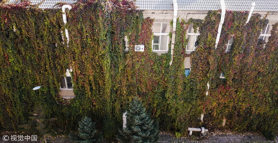 2017年10月21日,沈陽(yáng),懷遠(yuǎn)樓北側(cè)的墻面也是被爬墻虎所覆蓋,由于陽(yáng)光很少能照射到植被,所以爬墻虎大都還是綠色
