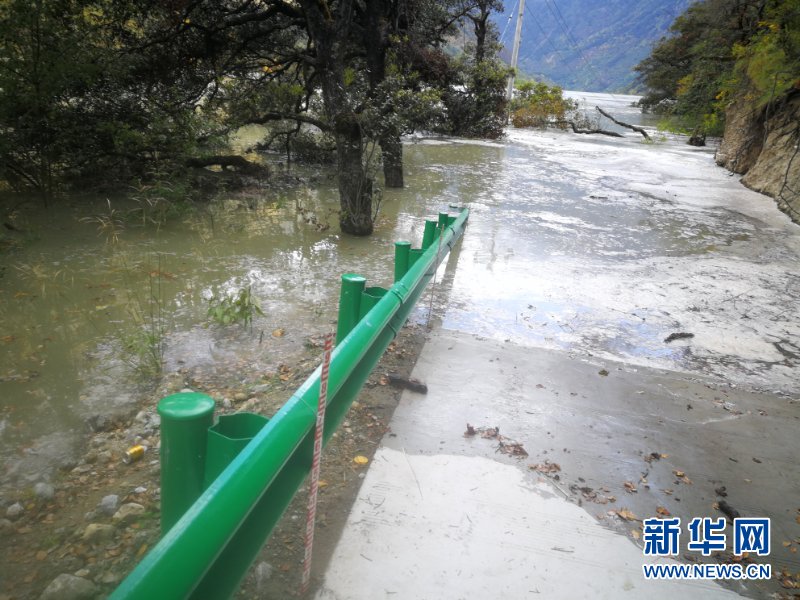 通往西藏林芝米林縣加拉村的道路被水淹沒(10月18日攝)。 新華社記者 覺果攝
