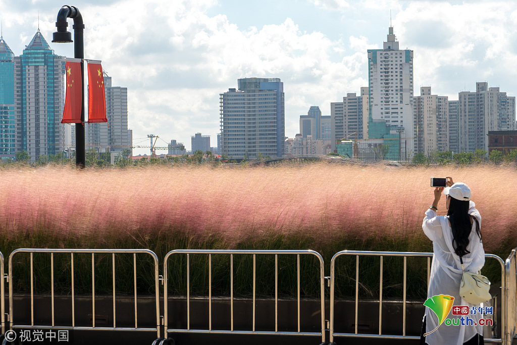 2018年9月28日,上海,東外灘楊浦濱江的粉黛亂子草目前已進(jìn)入盛花期,當(dāng)日早間,不少市民來(lái)到濱江拍照賞景,成片的紫色花海在藍(lán)天白云映襯下美不勝收。圖片作者:王岡/視覺中國(guó)