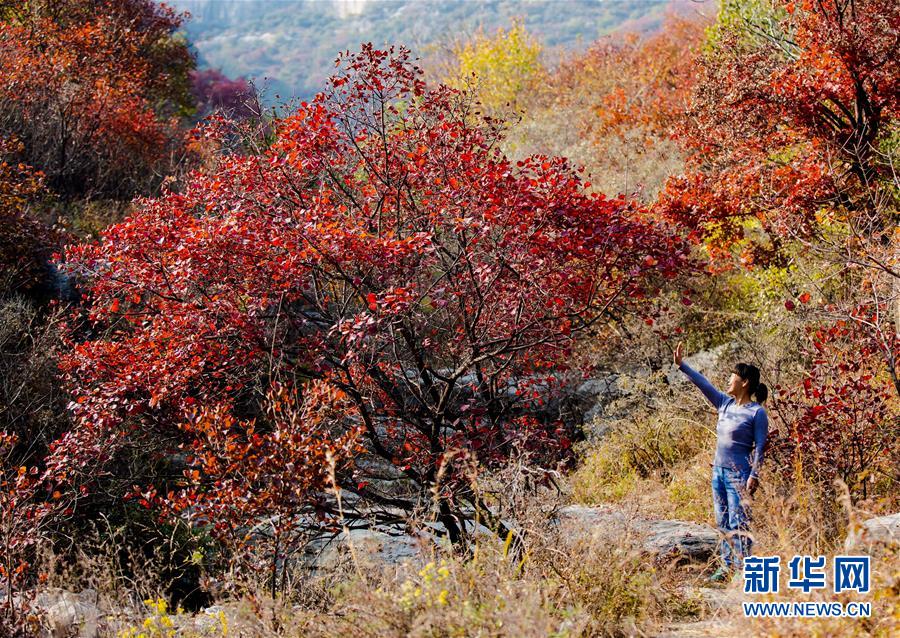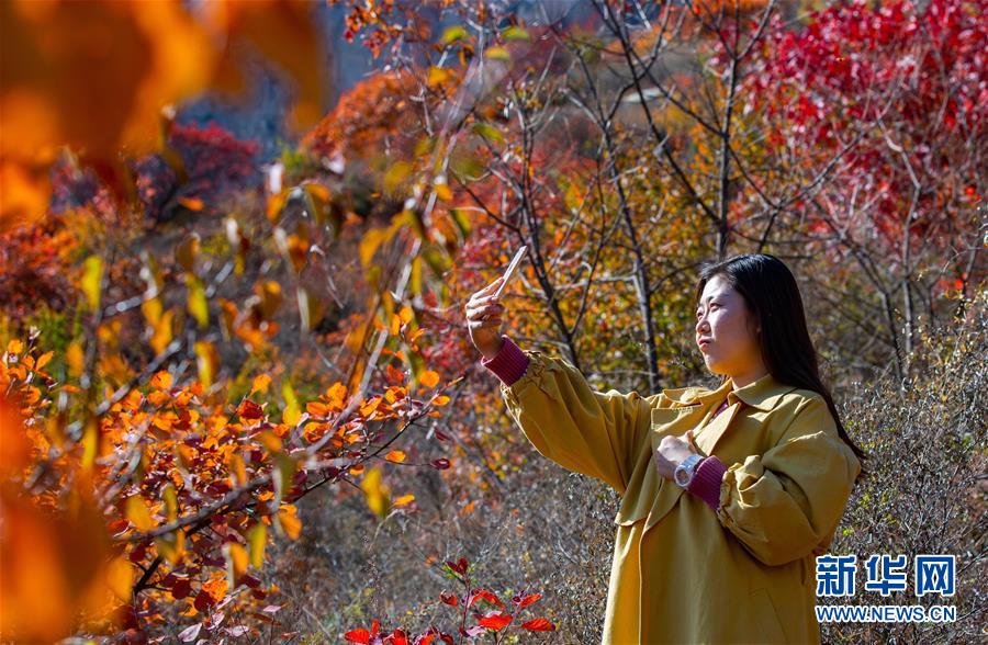 10月24日,游客在河北省武安市賀進(jìn)鎮(zhèn)后臨河村拍照留念。 金秋時節(jié),位于太行山區(qū)的河北省武安市賀進(jìn)鎮(zhèn)后臨河村的紅葉進(jìn)入觀賞佳期。 新華社記者 王曉 攝