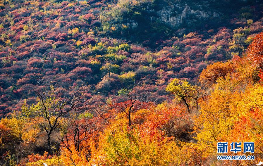 10月24日拍攝的河北省武安市賀進(jìn)鎮(zhèn)后臨河村景色。 金秋時節(jié),位于太行山區(qū)的河北省武安市賀進(jìn)鎮(zhèn)后臨河村的紅葉進(jìn)入觀賞佳期。 新華社記者 王曉 攝