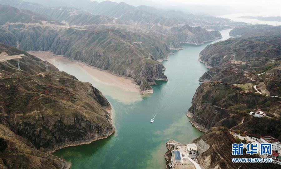 10月24日,一艘快艇從劉家峽水庫庫區(qū)的洮河與黃河交匯處駛過(無人機(jī)拍攝)。 新華社記者 陳斌 攝