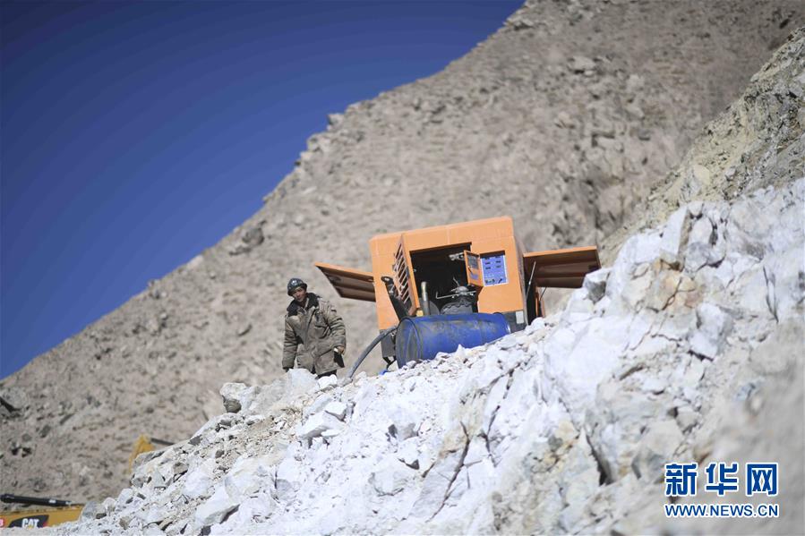 在昆侖山上海拔4000米的興發(fā)達(dá)玉礦,工程師田仲祥展示一塊正在開采的玉石礦體(10月23日攝)。  新華社記者武巍攝