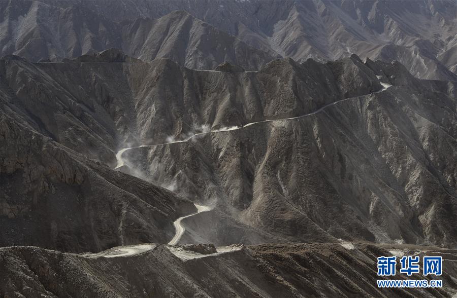 在距離且末縣縣城160多公里的昆侖山上的興發(fā)達(dá)玉礦,可見對面山上運(yùn)載銅鋅礦礦石的卡車行駛在簡易礦山公路上(10月23日攝)。 新華社記者武巍攝