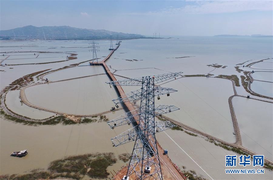 這是建在莆田平海灣上的輸送風電鐵塔和橫跨平海灣的全路徑棧橋(10月25日無人機拍攝)。 新華社記者林善傳攝