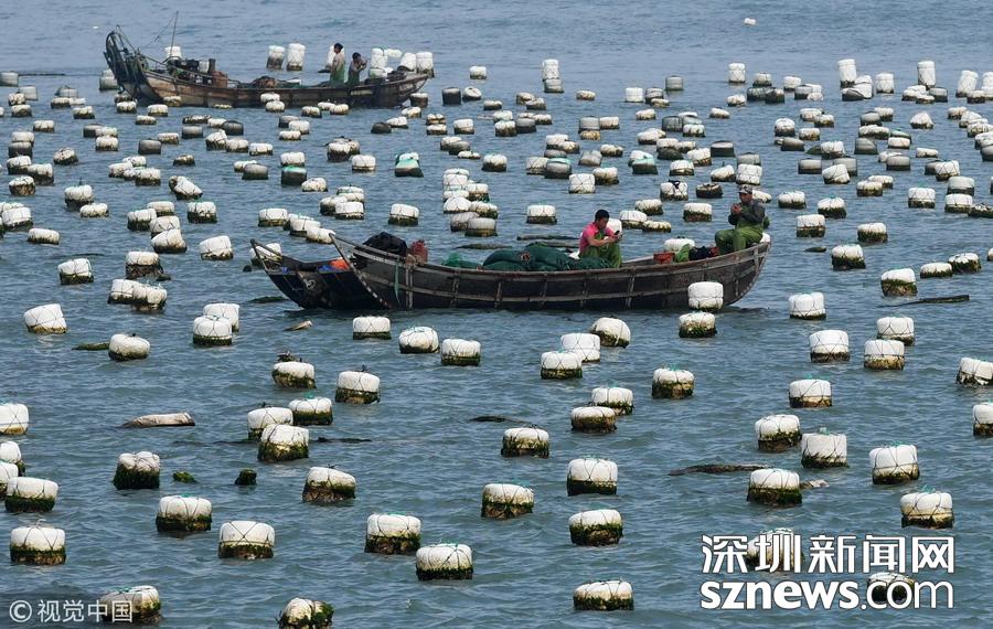 2018年10月26日,在福建連江海域上,“海上田園”網(wǎng)箱羅列,漁排上搭建的木屋錯(cuò)落成“戶”,蔚為壯觀,成為一道獨(dú)特的風(fēng)景線。福建省連江縣是中國(guó)鮑魚養(yǎng)殖第一大縣。