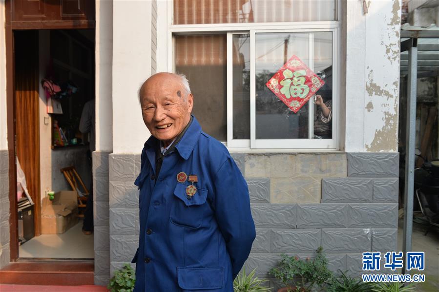 現(xiàn)已83歲的村民姚榮生佩戴紀(jì)念章站在自家院中(10月23日攝)。姚榮生生于1935年,曾參加抗美援朝戰(zhàn)爭(zhēng),現(xiàn)在開(kāi)弦弓村與兒孫們生活在一起。 新華社記者 尹棟遜攝