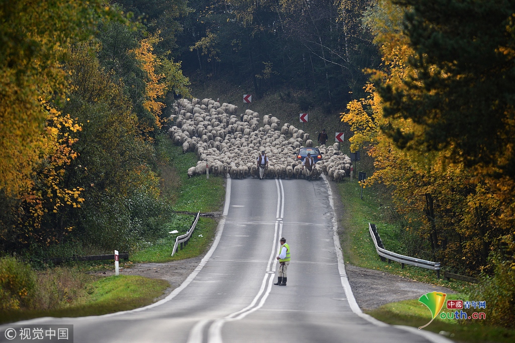 2018年9月27日訊(具體拍攝時間不詳),波蘭,浩浩蕩蕩的綿羊大軍為了趕在冬天之前回到農(nóng)場過冬,阻斷了鄉(xiāng)村的主車道。