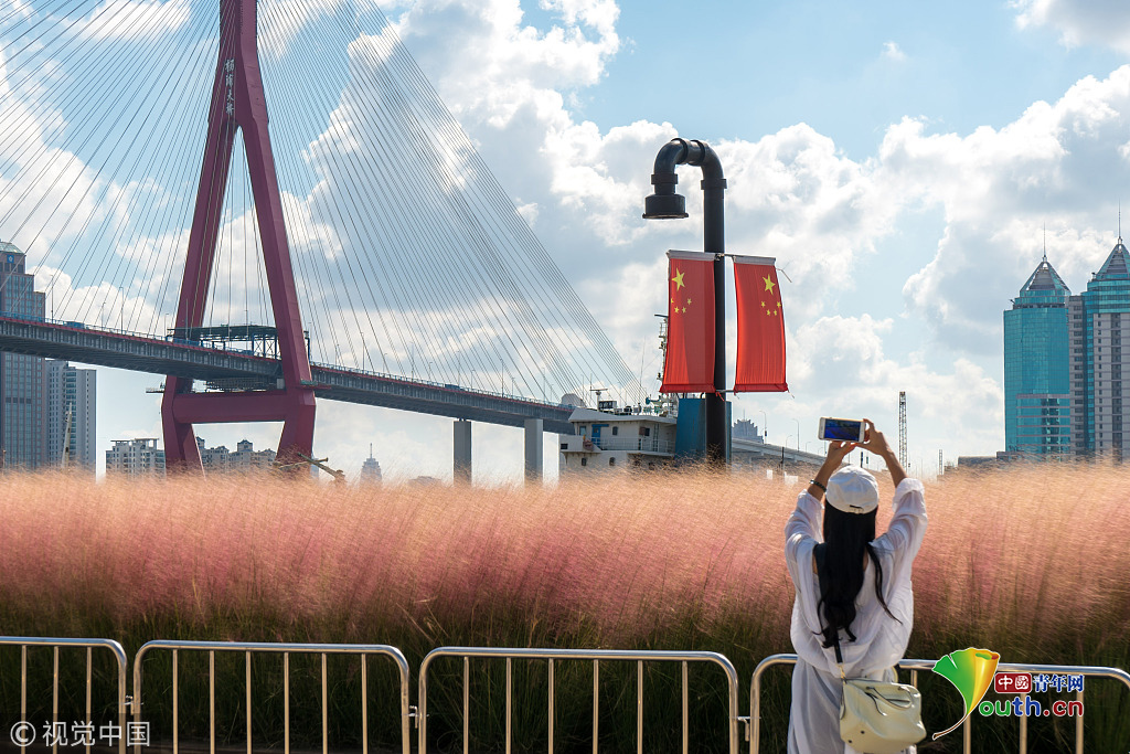 2018年9月28日,上海,東外灘楊浦濱江的粉黛亂子草目前已進入盛花期,當日早間,不少市民來到濱江拍照賞景,成片的紫色花海在藍天白云映襯下美不勝收。圖片作者:王岡/視覺中國